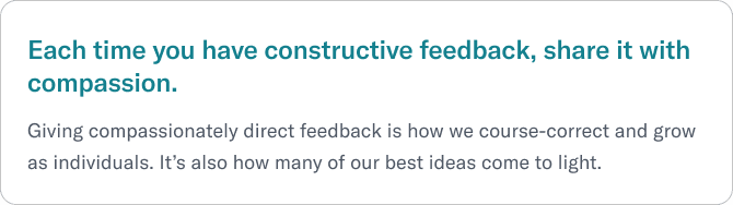 And how we give feedback matters. The key is sharing feedback with compassionate directness. Compassionate directness is all about speaking up, disagreeing, and surfacing problems and pain points in real time. And doing it with compassion, empathy, and understanding.