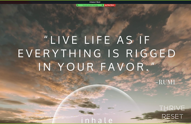 And the Thrive Reset Zoom App brings this idea to the Zoom meeting. It’s based on neuroscience that shows that we can course-correct from stress in 60 to 90 seconds. That’s all it takes to complete a Reset. You can use it at the beginning of a meeting to start out fresh, in the middle to stay focused and present, or at the end to help you recenter before moving onto your next Zoom meeting, or the rest of your day. And it only takes 60 seconds.